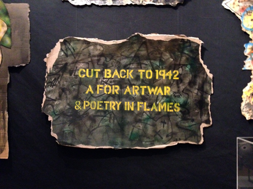 Listing the similarities to other artists; Keith Haring, Basquiat, Kurt Schwitters, Rauschenberg, Picasso, Terry Gilliam, Futurist poetry, punk fanzines, Anselm Kiefer, Robert Crumb… I noted that the one unifying voice among all of this was the sense of anarchy. In fact the tag line of ARTWAR that adorns many of his pieces suitably sums up his destruction of other’s visual signatures.
