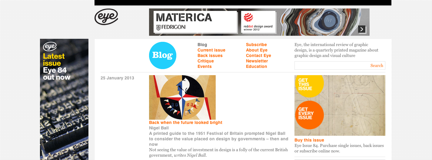 25 January 2013Critique, Education, Graphic Design, History Leave a comment Back when the future looked bright My first article for Eye magazine’s blog was published today. It is available to read here. Share this: Click to share on X (Opens in new window) X Click to share on Facebook (Opens in new window) Facebook Click to share on LinkedIn (Opens in new window) LinkedIn Click to share on Tumblr (Opens in new window) Tumblr Click to email a link to a friend (Opens in new window) Email More Click to share on Reddit (Opens in new window) Reddit Click to share on Pinterest (Opens in new window) Pinterest Like Loading...